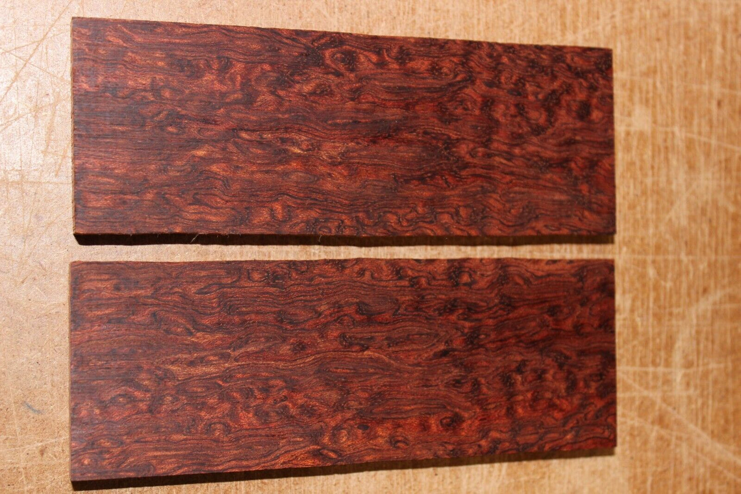 Description: Bubinga AKA African rosewood knife scale. Cut from dry and well seasoned stock. Surfaced flat on both faces. Wood is shown dampened with denatured alcohol and dry.